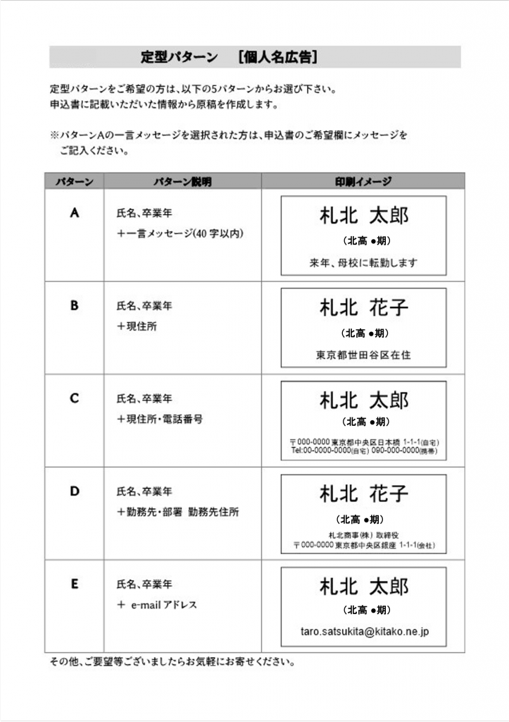 同窓会の事業は、皆様からお寄せ頂いた広告掲載料により支えられております。ご事情が許す限りでご検討をお願いさせていただく次第です。仲間たちへの激励メッセージなどのかたちで掲載をご検討いただければ幸甚です。広告定型パターンもご用意しております。